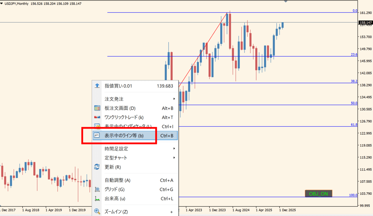 オブジェクト名の確認方法は、まずチャート上で右クリックして「表示中のライン等」をクリックします