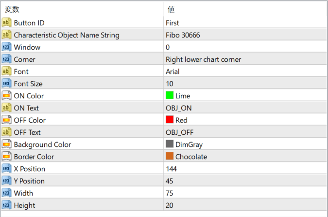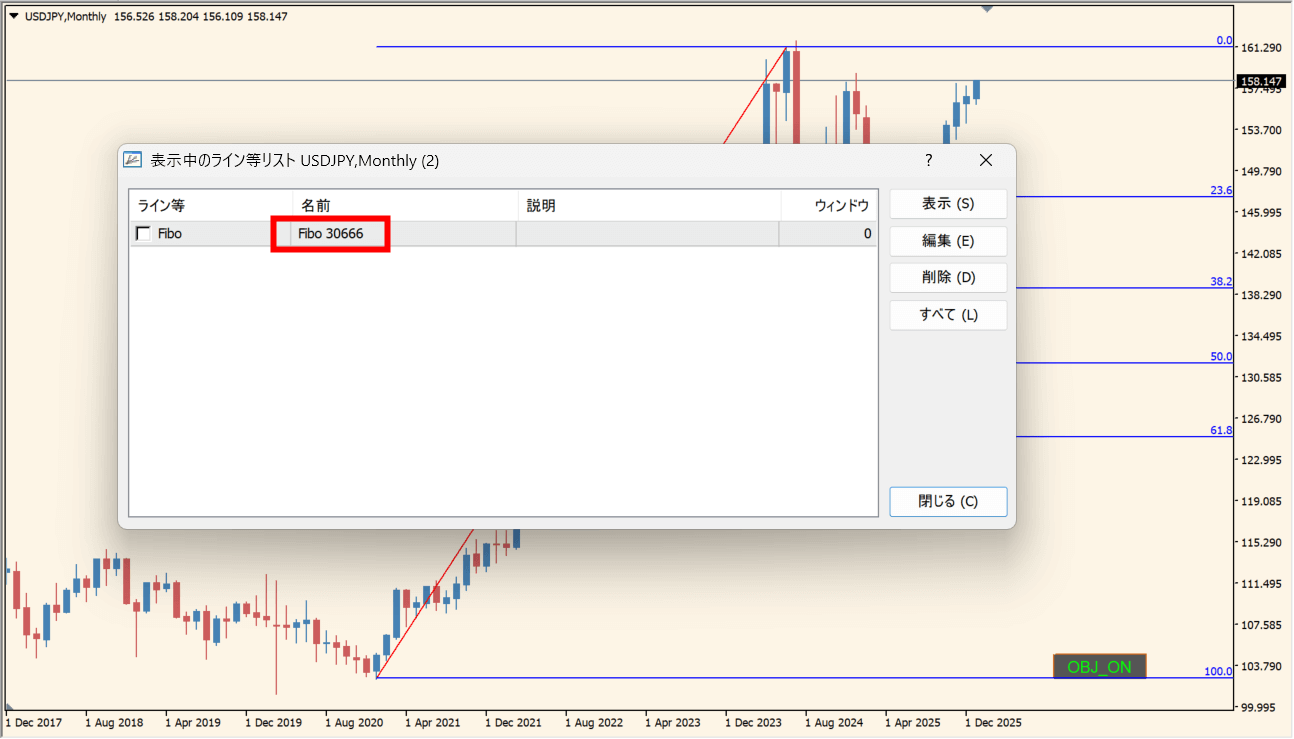 一致するオブジェクト名を持つライン、ボックス、フィボナッチなどが対象となり、チャート上に表示されるボタンをクリックするだけでオンオフが可能です。