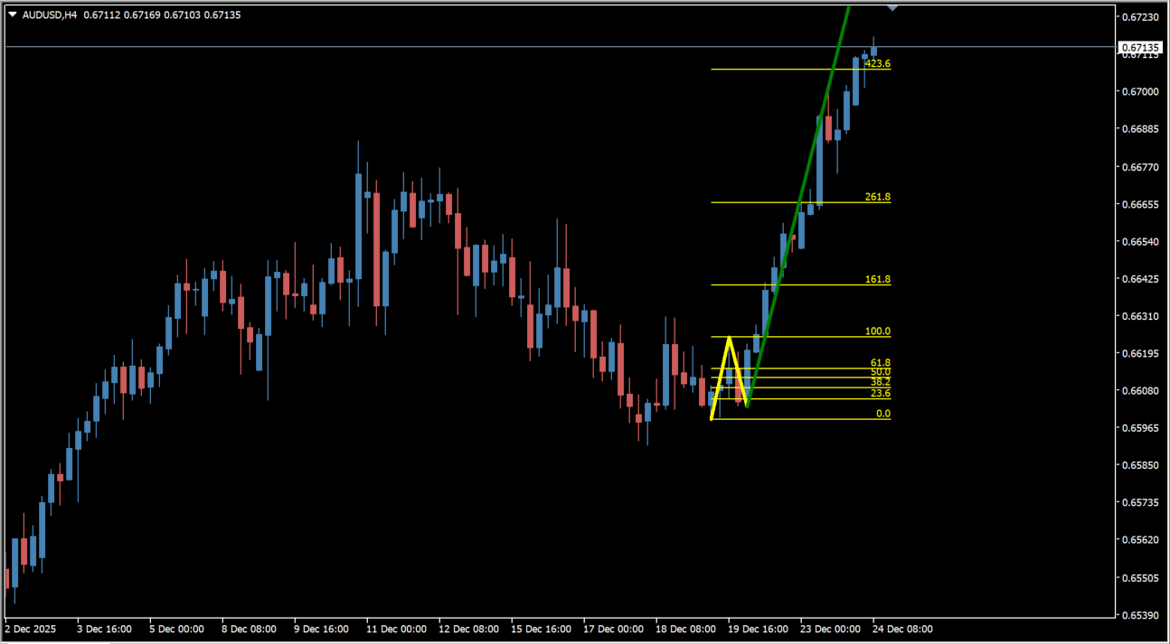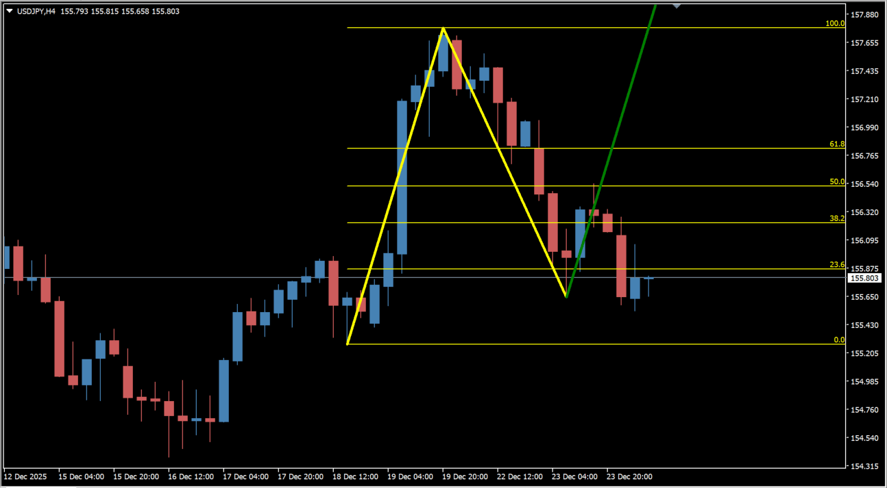 さらに、パターンの起点と終点を基準にフィボナッチが自動描画され、複数の価格帯が支持帯・抵抗帯として機能します。これにより、エントリー位置だけでなく、利確や損切りの目安も視覚的に把握できます。