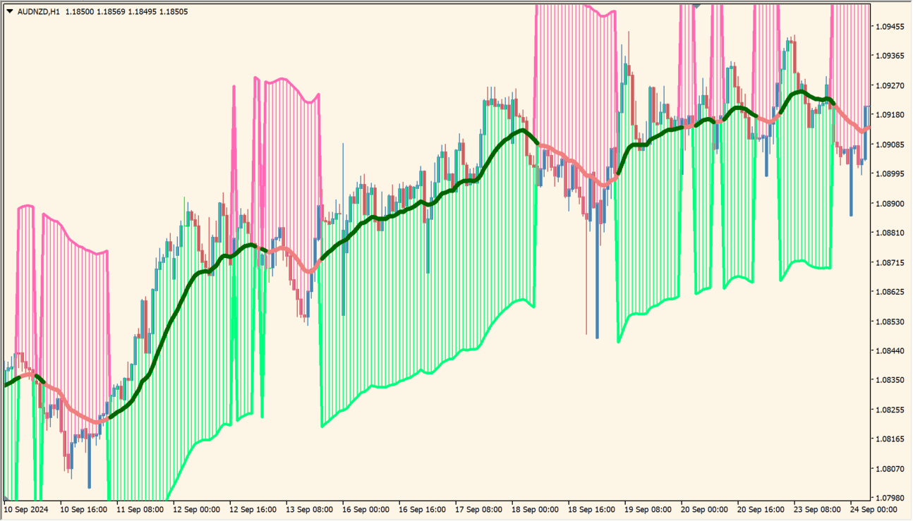 価格に追従する移動平均線を基準に、上昇時は緑、下降時はピンクのゾーンを描画して相場の方向性を直感的に判断できます。