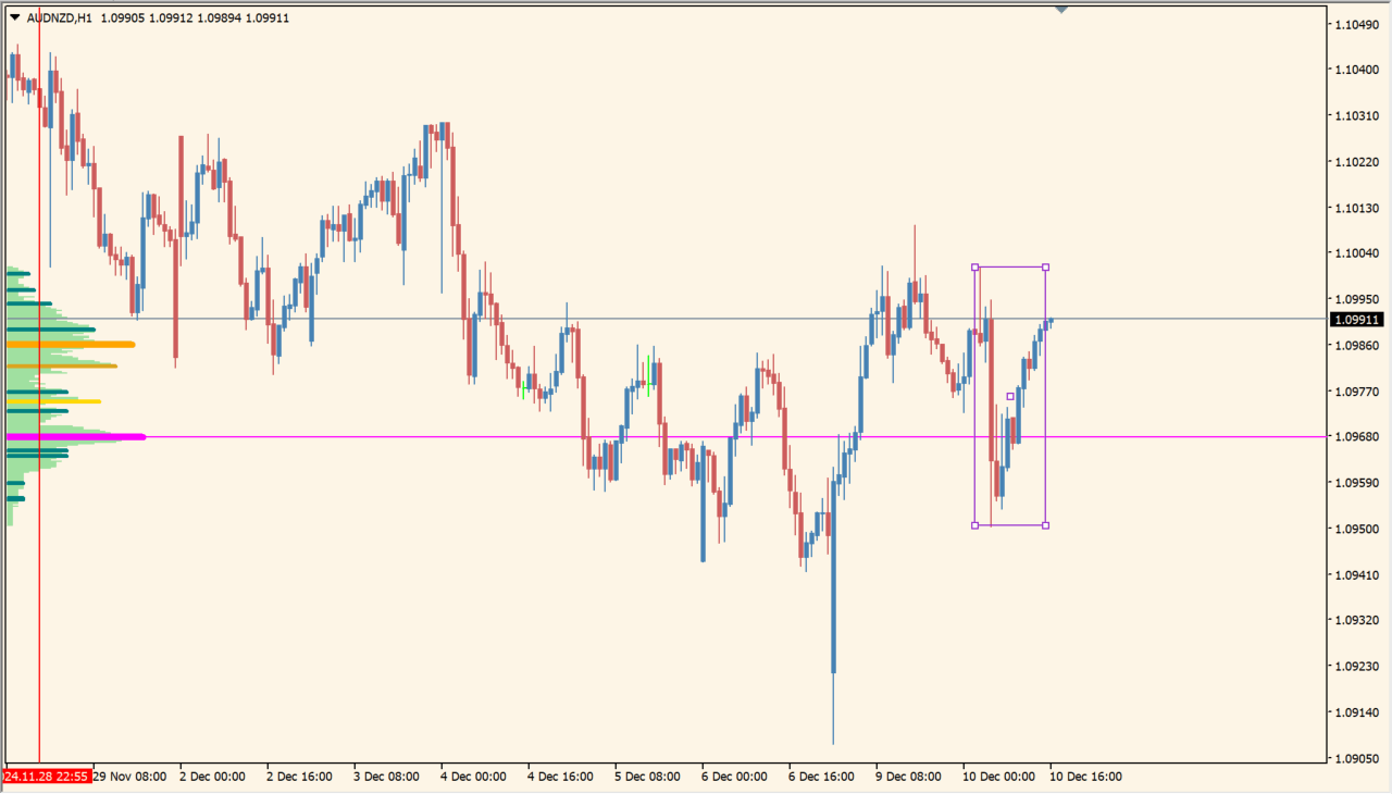 FXではポピュラーな、価格別の出来高を表示してくれるボリュームプロファイルインジケーターです。この「tpo2」はその中でもチャート上のレクタングルで計算期間を変更が可能に作られています。