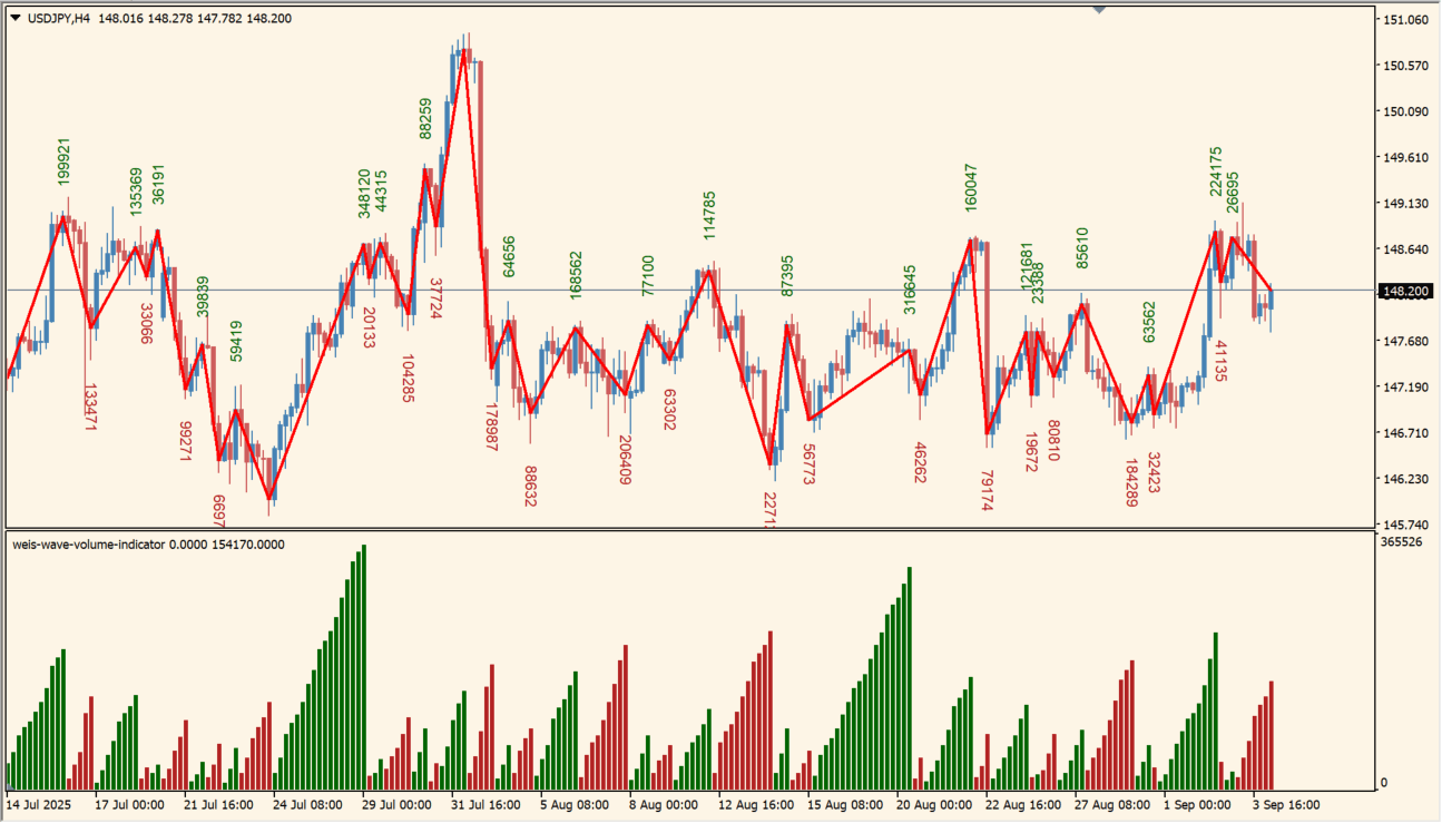 Weis Wave Volumeインジケーターは、価格と出来高を「波」として表現し、トレンドの方向と強さを明確に示します。