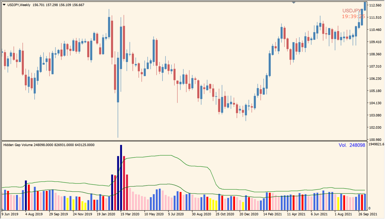 - 出来高の質と勢いを色分けで可視化する「Hidden Gap Volume Indicator」