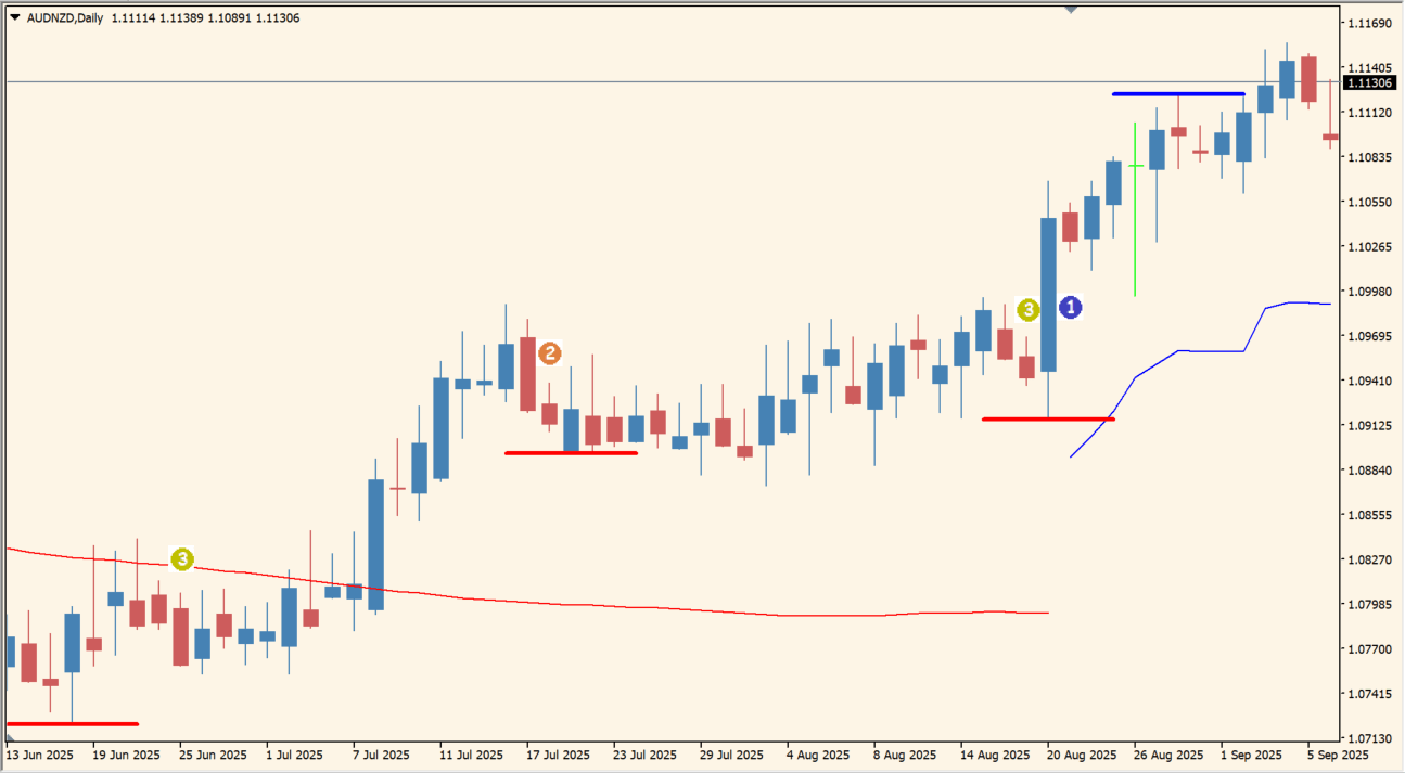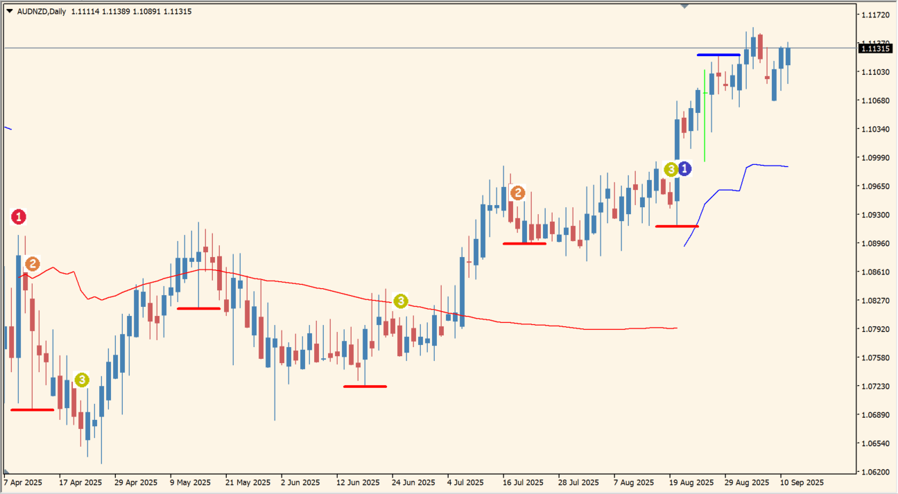 チャート上に①~③の番号付きシグナルを表示してトレンドの重要局面を示します。(青い番号は買い、赤い番号は売り)