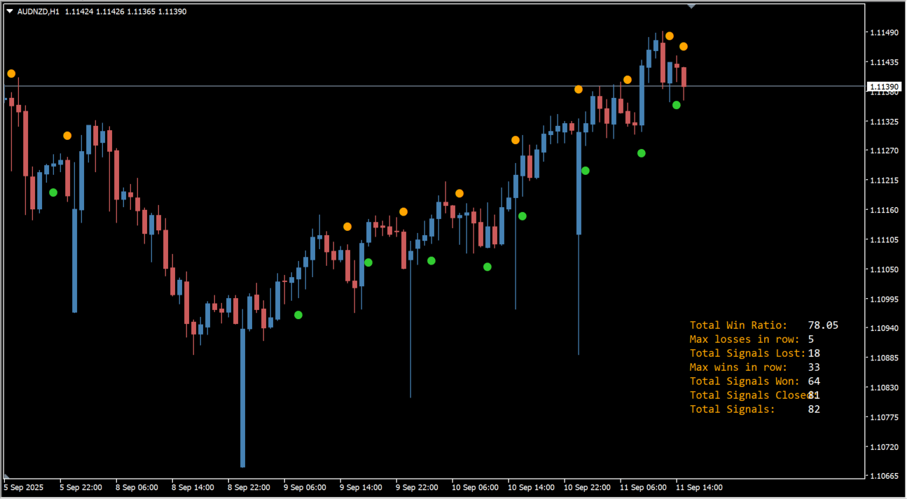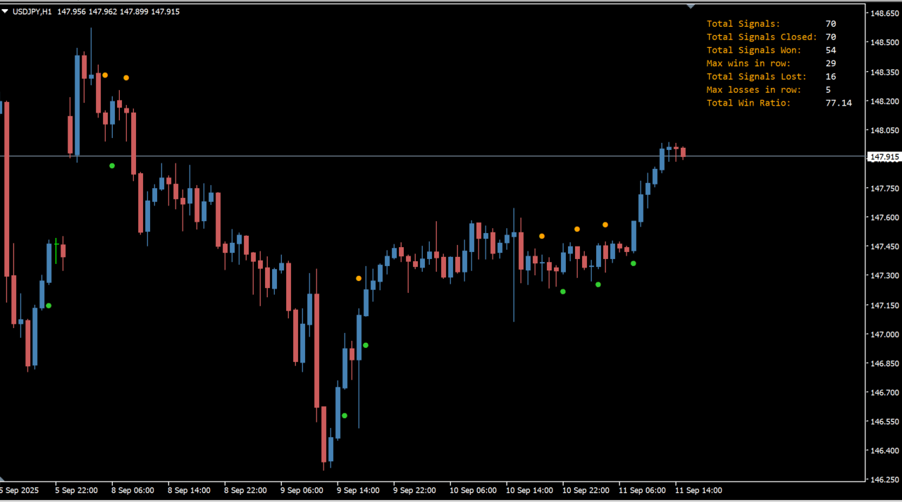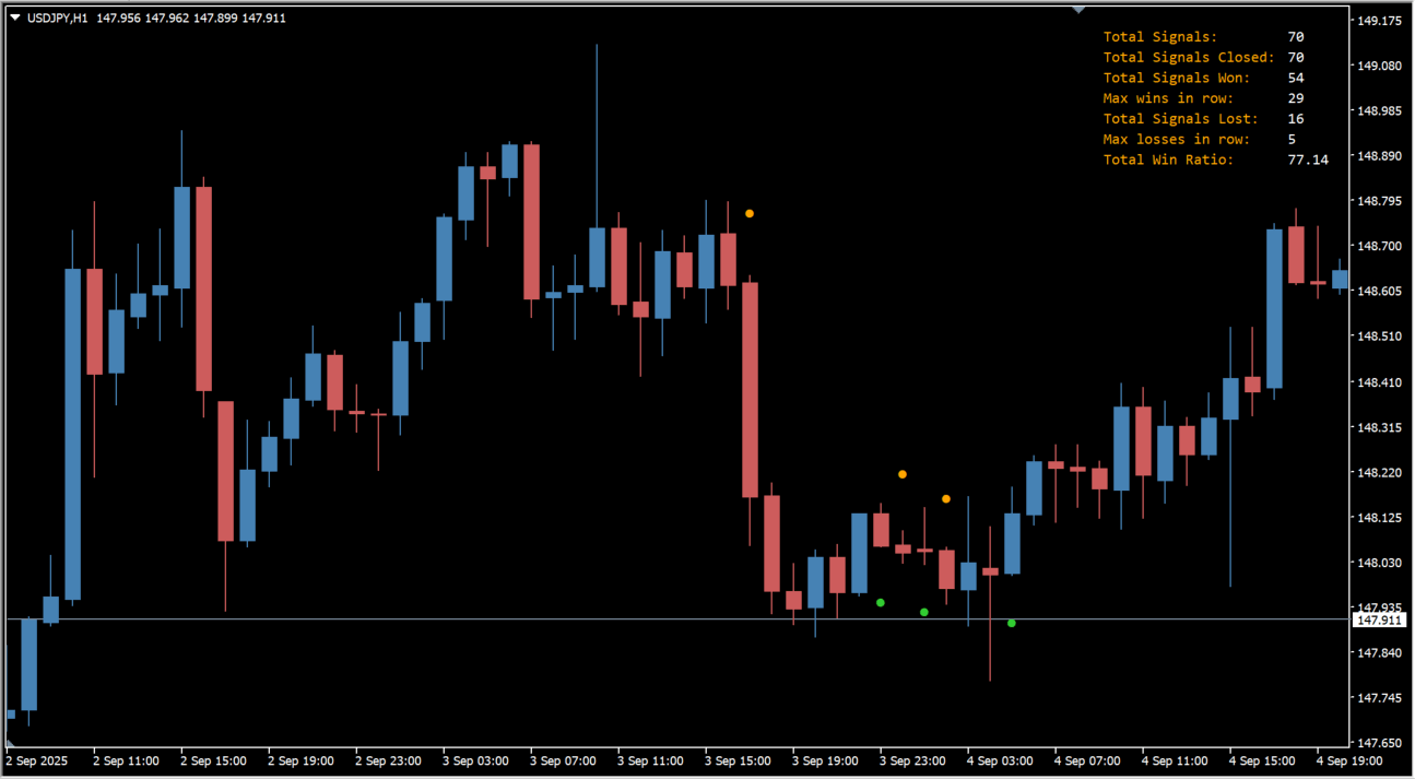 ダッシュボードには「勝率」「勝ち数・負け数」「連勝・連敗回数」などが自動表示され、過去のパフォーマンスを一目で確認できます。これによりシグナルの信頼性を検証しながら運用可能です。