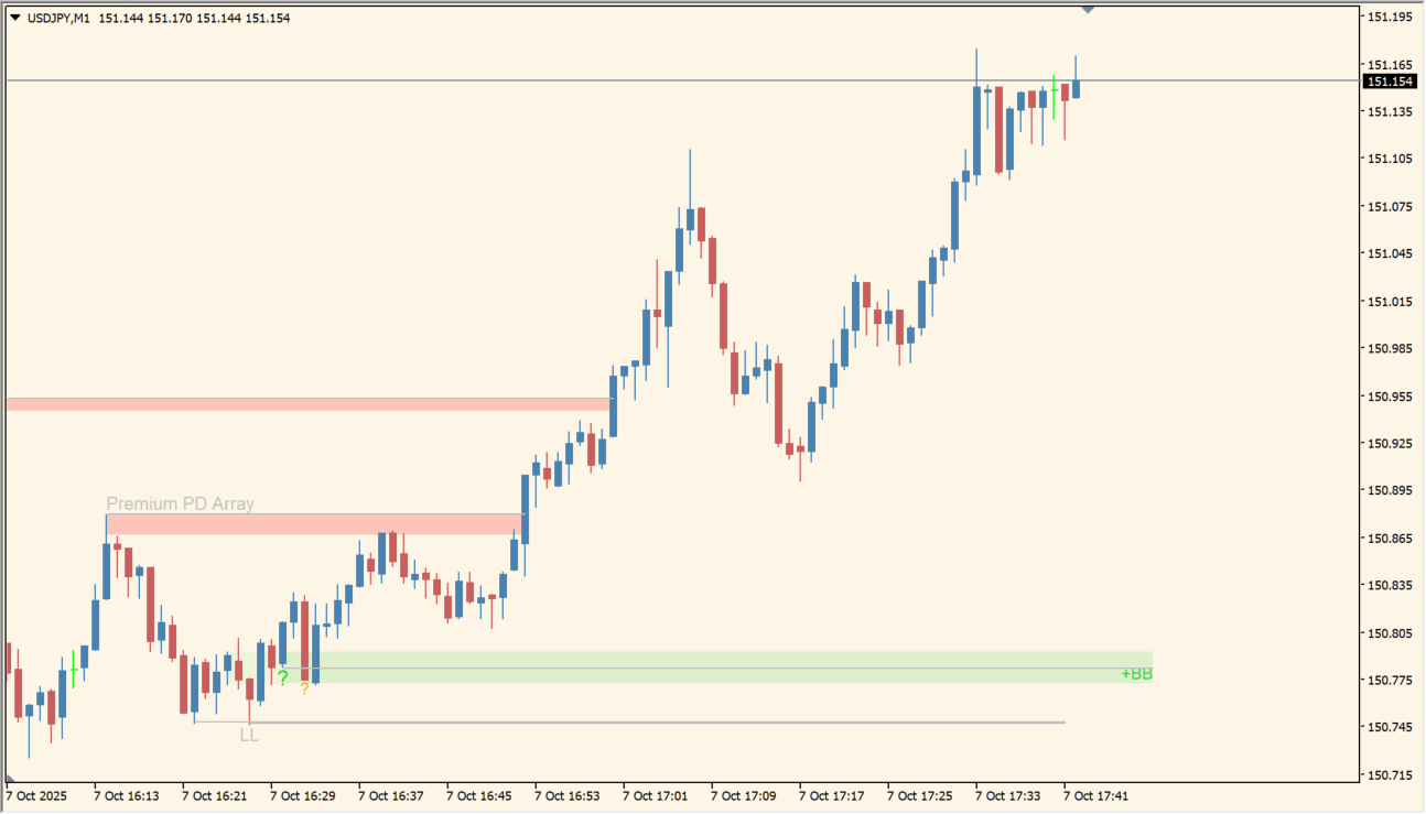 さらに、PD Array(Premium/Discount Array)を自動描画し、価格の到達目標や注目ゾーンを示します。