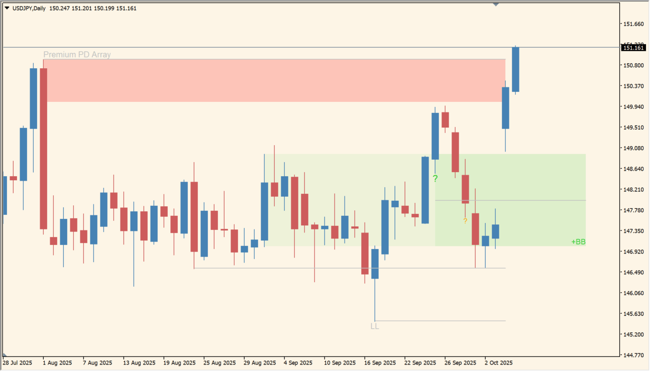 • Premium PD Array:高値圏のプレミアムゾーン。ロングの利確やショートのエントリーポイント候補。