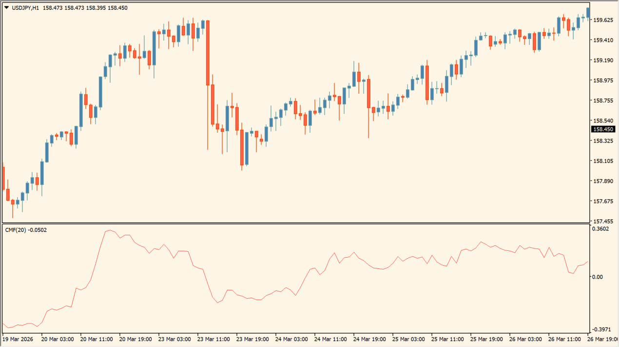 このインジケーターは「チャイキンマネーフロー(CMF)」を表示するもので、一定期間における資金の流入出を数値化したものです。価格の終値が高値寄りで引けるほど買い圧力が強く、安値寄りで引けるほど売り圧力が強いという考え方をベースに、そこへ出来高を加味して算出されます。