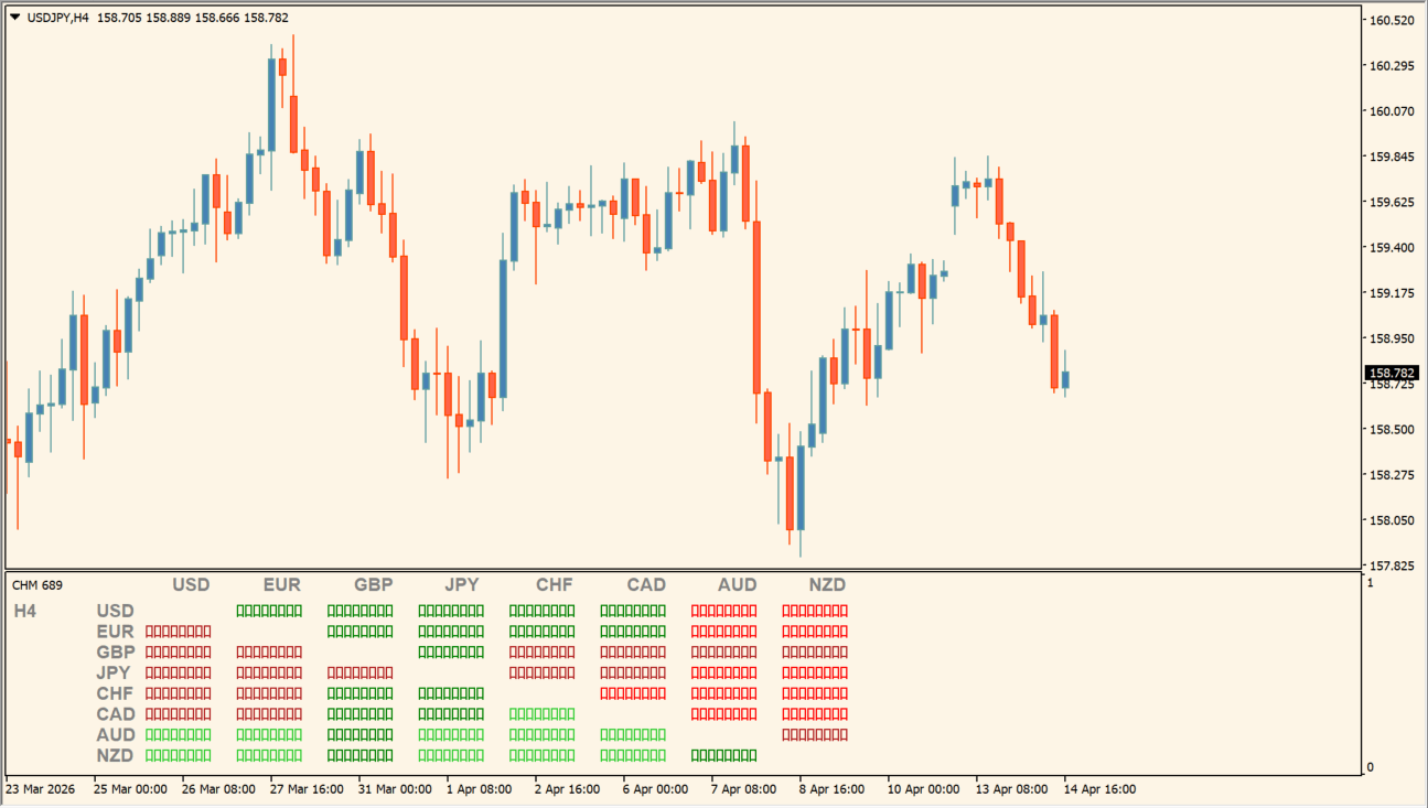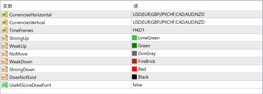 複数通貨の強弱をヒートマップ形式で表示するインジケーターです。通貨同士の力関係を色で直感的に把握でき、どの通貨が強くどれが弱いかを一目で判断可能。