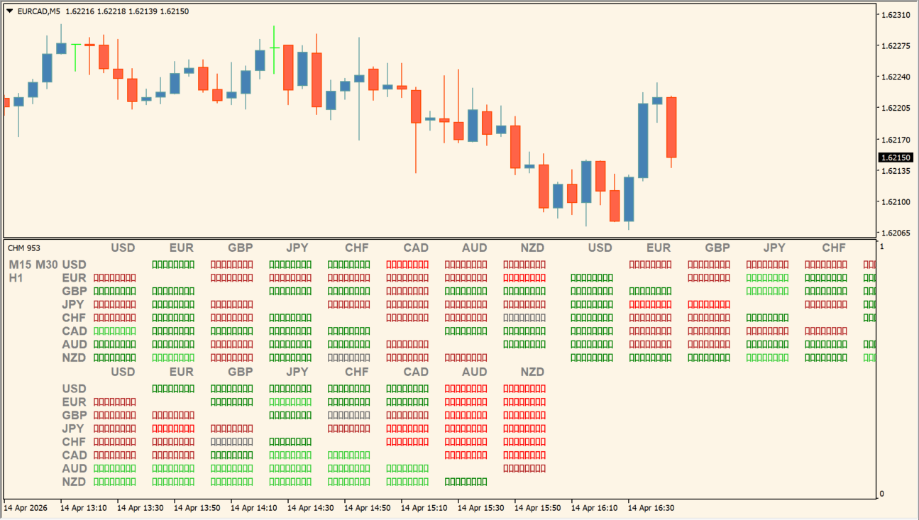 このインジケーターは、USD・EUR・GBPなど主要通貨の強弱をマトリクス形式で表示し、緑は強さ、赤は弱さを示します。横軸と縦軸の組み合わせにより、通貨同士の相対的な強弱が可視化され、どの通貨ペアがトレンドを形成しやすいかを判断できます。