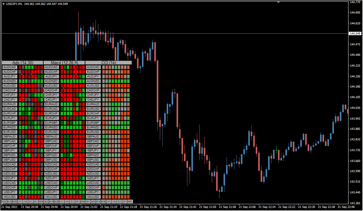 ADX、CCI、MACDの3種類のヒートマップインジケーターが同封されており、1つのテクニカルに付き1つのインジケーターを適用します。
