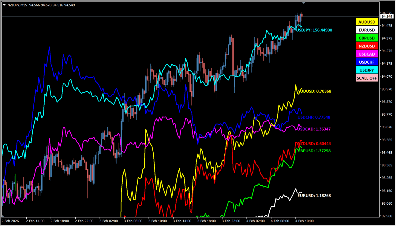 計算ロジックによりますが、多くの通貨強弱インジケーターは最新のレートに基づいて常に再計算を行うため、過去の強弱バランスの見え方が後から変わる(リペイントする)場合があります。