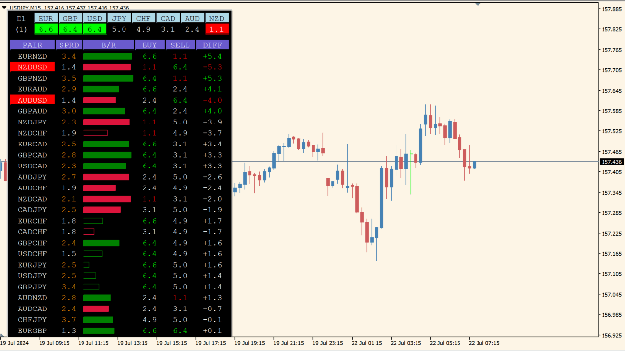 複数の通貨ペアを監視し、現在どの通貨が強いのかを見やすく一覧表示してくれるインジケーターです。