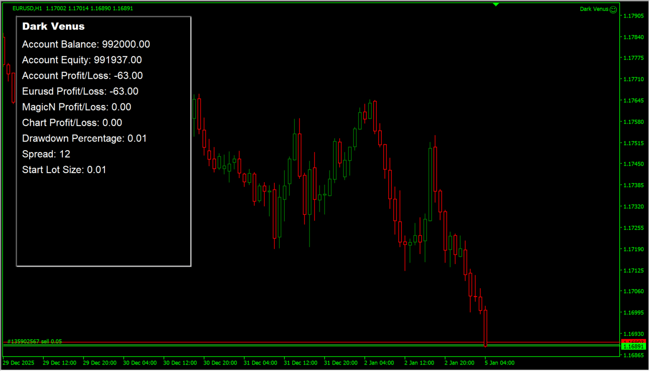 Dark Venus EAは、ボリンジャーバンドとトレンド分析を組み合わせ、相場の方向性と勢いを判断します。
