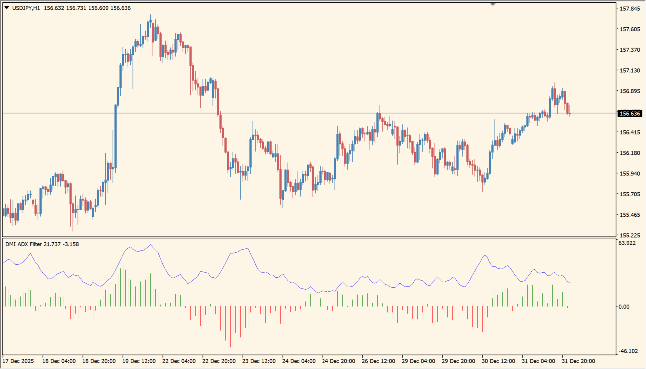 ヒストグラムとライン表示により、相場がトレンド局面かレンジ局面かを直感的に把握できます。