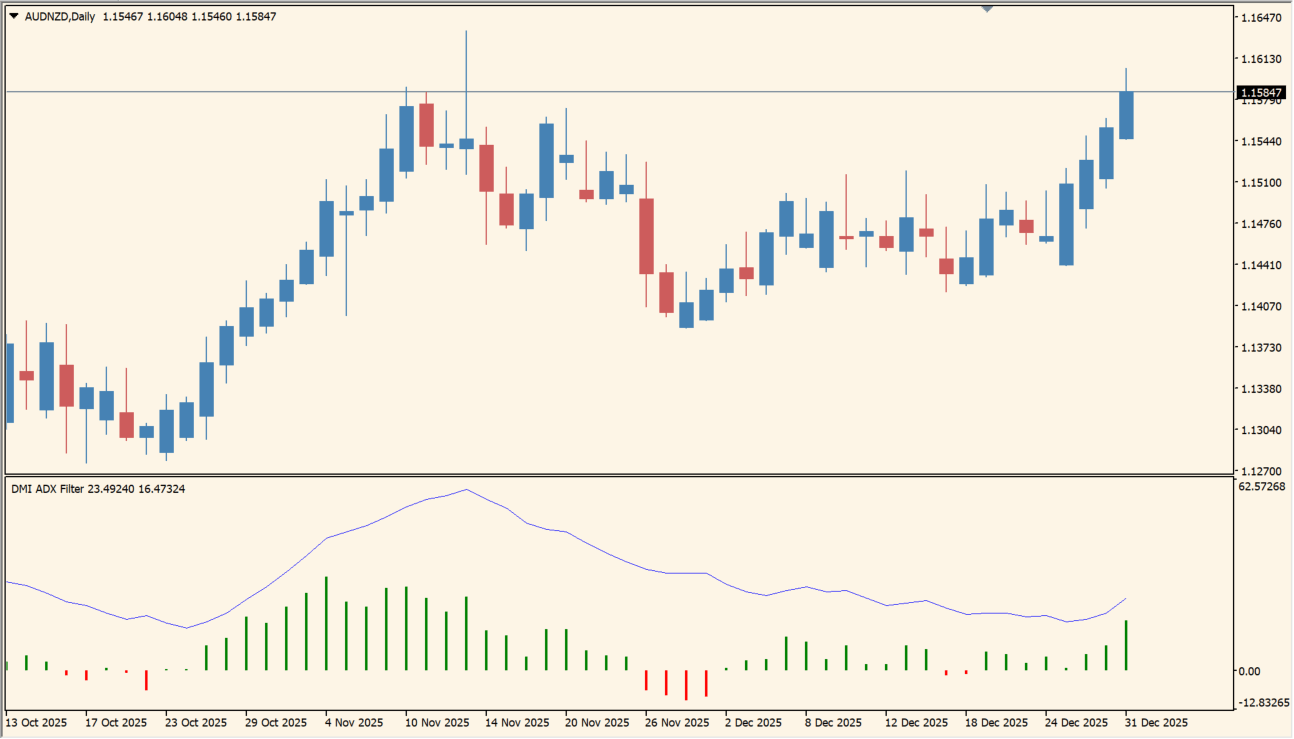 このインジケーターは、プラス方向とマイナス方向のヒストグラムでトレンドの向きを表し、同時にADXラインでトレンドの強さを示します。