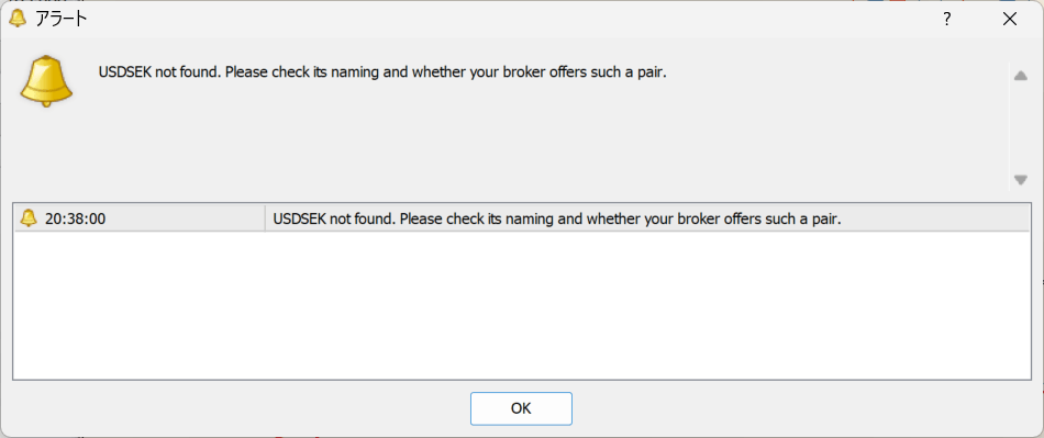 このように特定の通貨が見つからないと出たら、その通貨を一度チャートに表示されれば警告は消えます