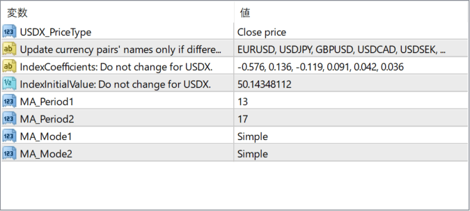 各通貨ペアの重み付け係数を設定します USDXの算出に影響します
