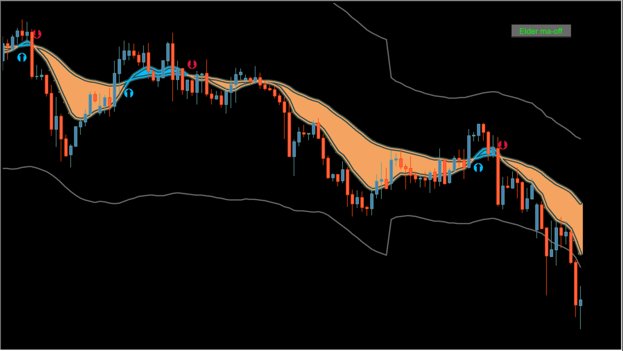エルダー理論をベースにしたエンベロープと、2本の移動平均線リボンを組み合わせたMT4用インジケーターです。