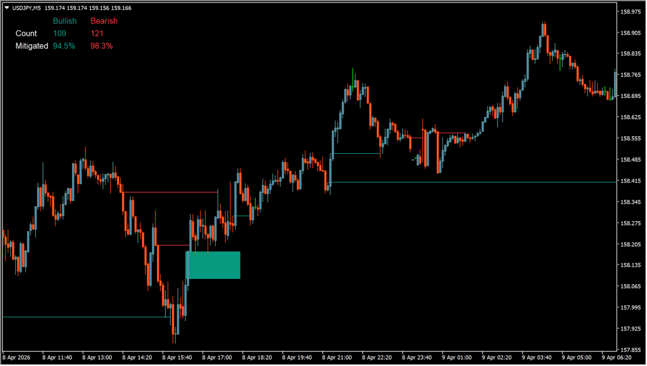 過去のFVGの発生数や埋まり率も表示でき、相場の戻りやすさを客観的に把握できます。シンプル表示から詳細分析まで対応可能です。
