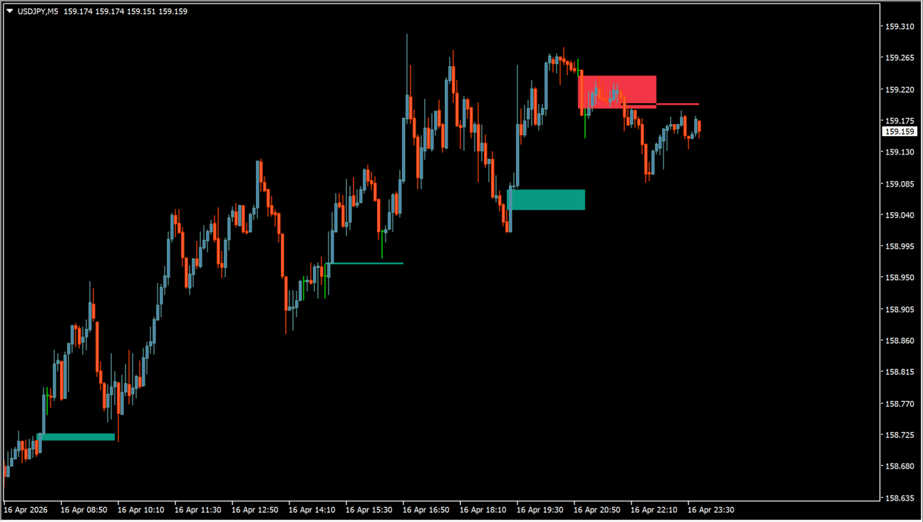 ライン描画を有効にすると、すでに埋められたFVGも点線で確認でき、過去の反応ポイント分析にも使えます。短期足でのエントリー補助から中期のゾーン分析まで幅広く対応します。