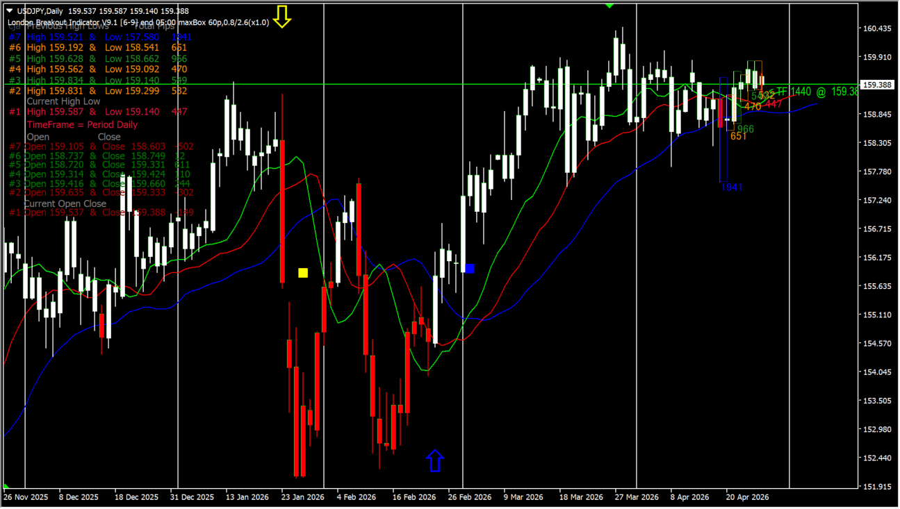 左上のパネルは、ロンドン時間における過去と現在の高値・安値(High/Low)および始値・終値(Open/Close)を一覧で表示する統計情報です。各日の値幅や上昇・下降の結果が数値で確認でき、相場のボラティリティや方向性の傾向を把握できます。現在の高値・安値はブレイク判断の基準となり、トレード戦略の組み立てに役立ちます。