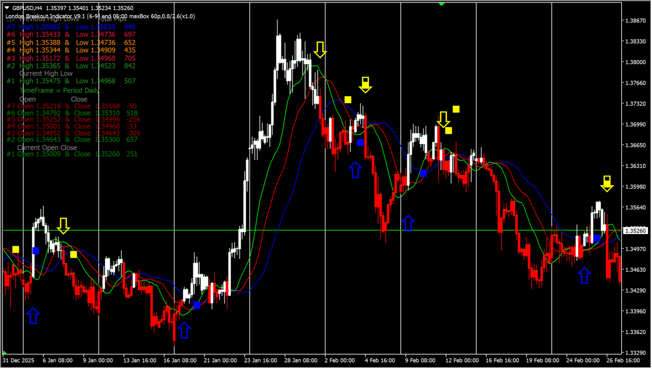 このインジケーターはロンドン市場開始前後の一定時間の高値・安値を基準に、そのレンジをブレイクしたポイントを検出します。