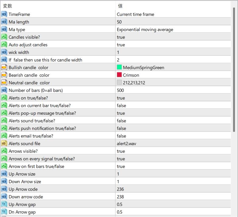 ロジックとしては、出来高の変化と移動平均線を基準に売買シグナルを生成します。上昇傾向では緑系のローソク足と上向き矢印が表示され、下降傾向では赤系のローソク足と下向き矢印が表示されます。