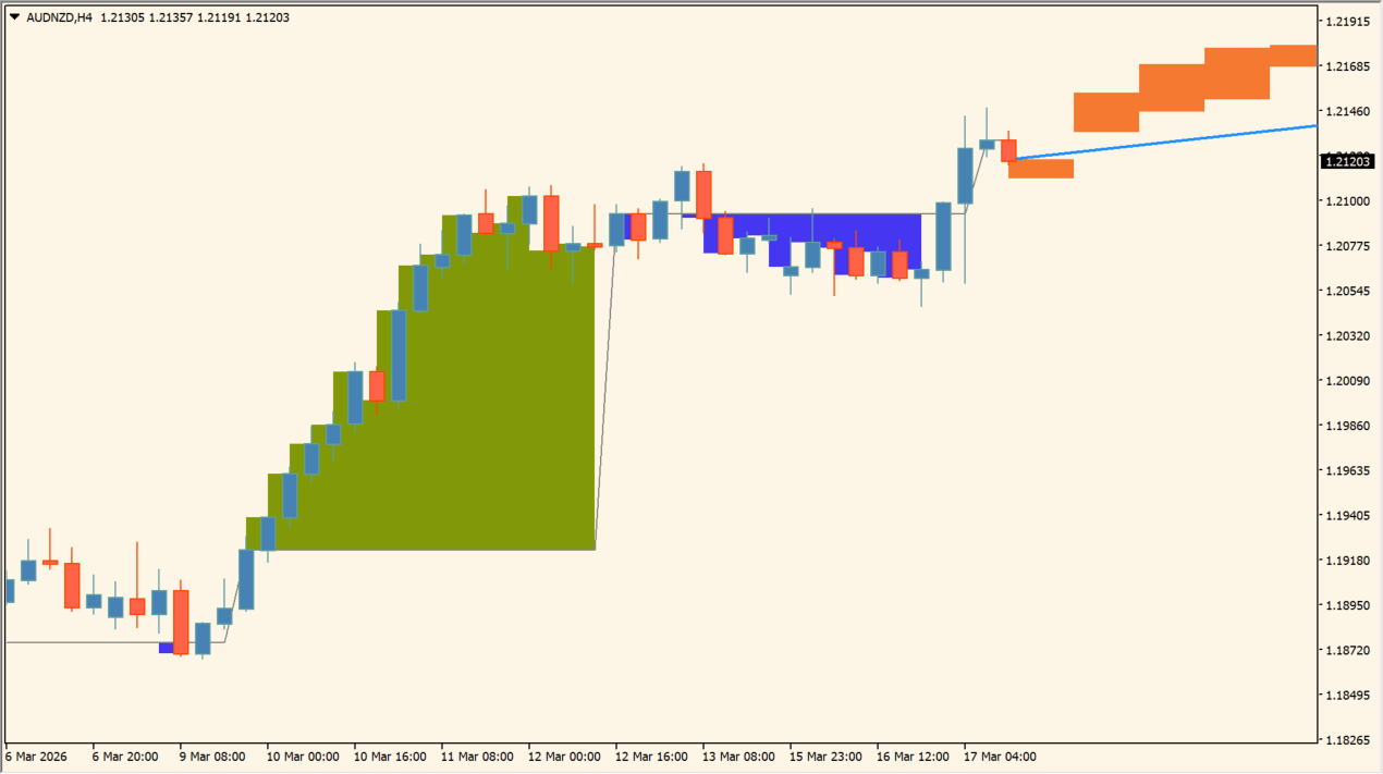 MACDの変化をもとに過去の類似パターンを分析し、その結果から将来の価格推移をシミュレーションしてチャート上にゾーンとして表示します。緑色のエリアは上昇方向の予測ゾーン、青色やオレンジのエリアは下降方向や調整局面の可能性を示します。