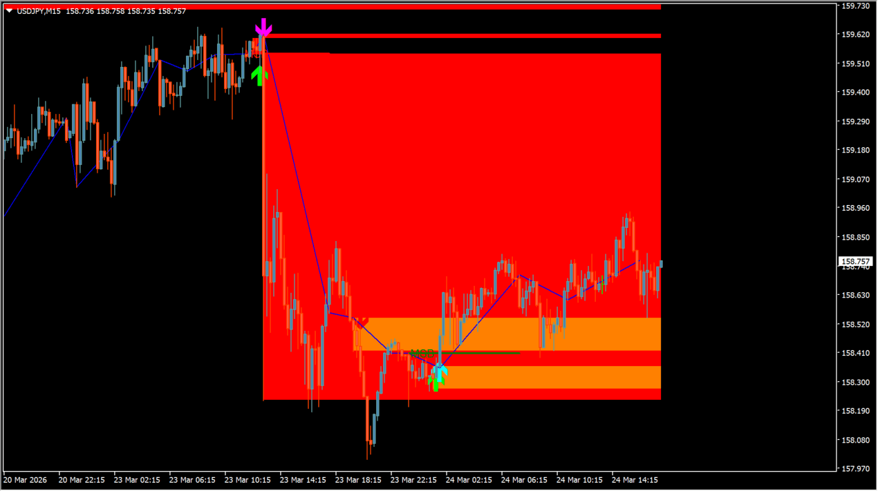 基本はトレンド方向に沿った順張りで、押し目・戻りをオーダーブロックで狙う使い方が有効です。レンジ相場ではブレイクラインと併用することでダマシ回避にも役立ちます。