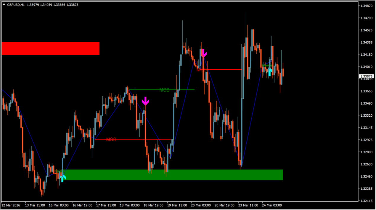 さらにオーダーブロックを自動描画し、価格がゾーンへ戻った際の反発ポイントをサインで通知。環境認識からエントリー判断まで一貫して使えるのが特徴です。