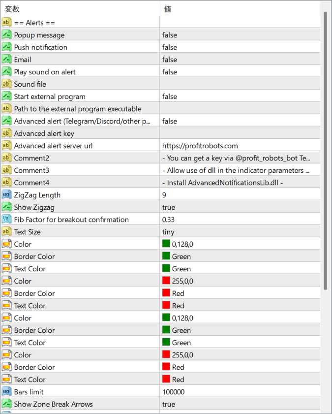 ゾーンブレイク時の矢印表示の有無を設定します