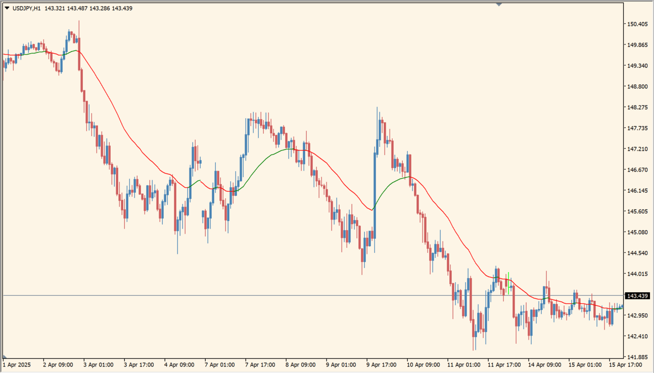 トレンドの向き:MAが右肩上がりなら上昇、右肩下がりなら下降トレンド。