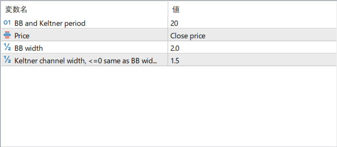 このインジケーターは、ボリンジャーバンドとケルトナーチャネルを同時に表示し、バンドの収縮状態いわゆるスクイーズを判別できるように設計されています。