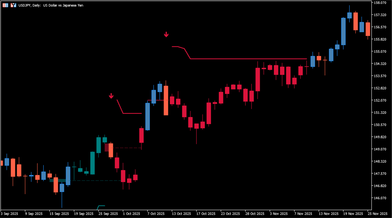 上昇トレンド中のFVG埋めは買い、下降トレンド中は売りシグナルとして機能します。チャート上にはトレーリングラインも表示され、利確や損切りの目安として活用可能です。