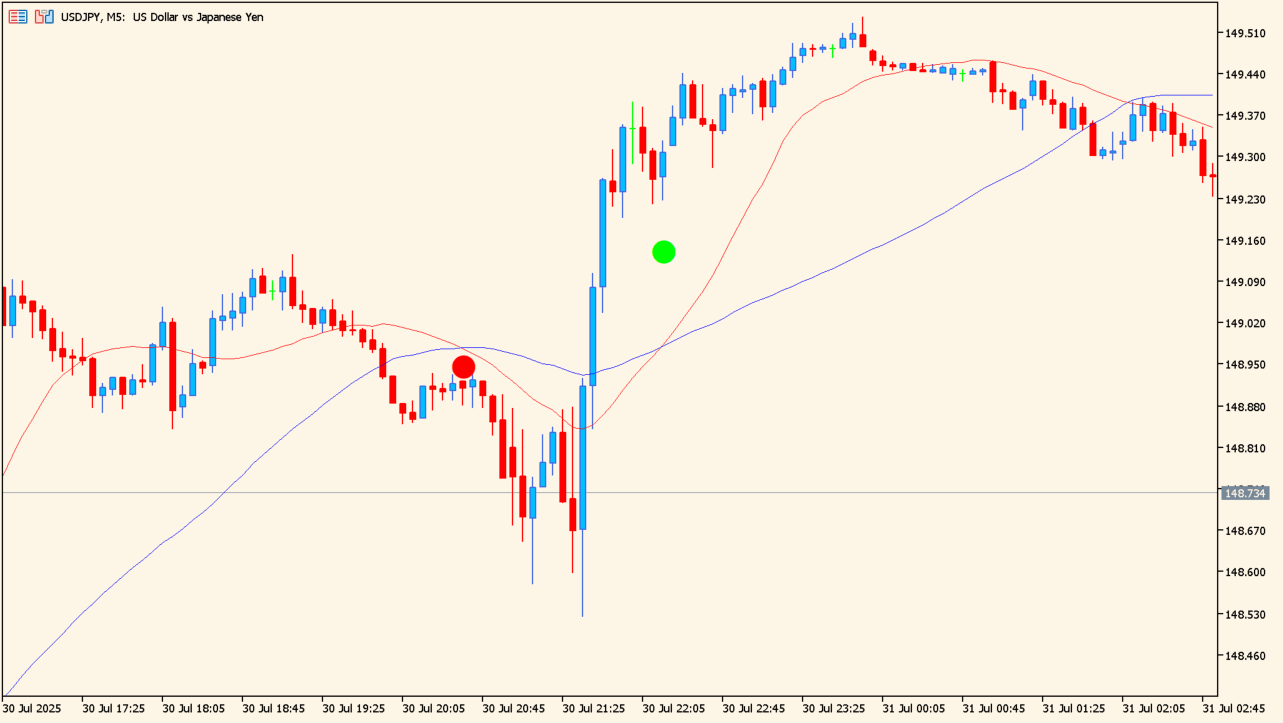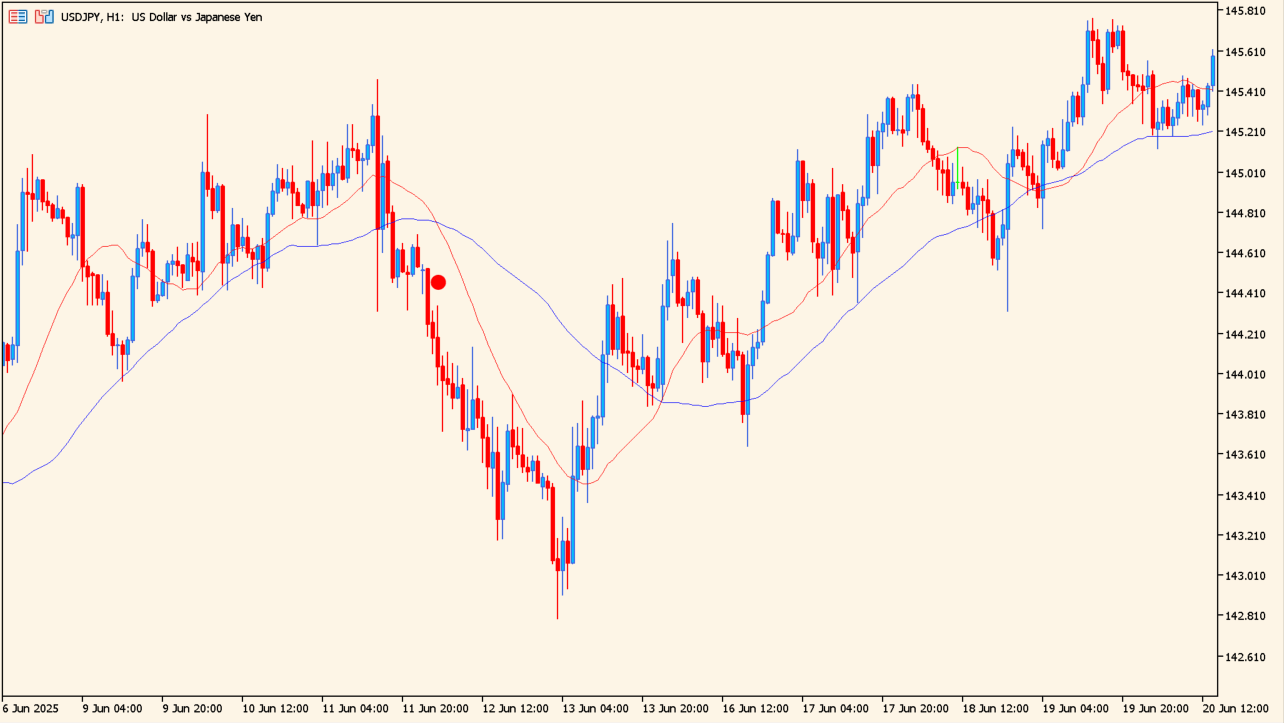 「nduet Indicator」は、2本の移動平均線にCCIフィルターを実装したインジケーターです。移動平均線のゴールデンクロスとデッドクロスでドットが表示されます。