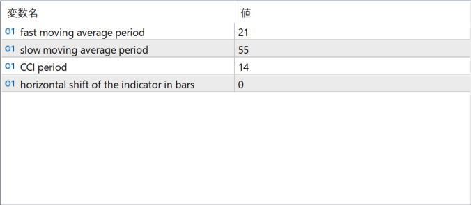 CCI period コモディティチャネルインデックス(CCI)を計算するために使用する期間(バー数)。この値によって、CCIの感度とシグナルの頻度が変わります。