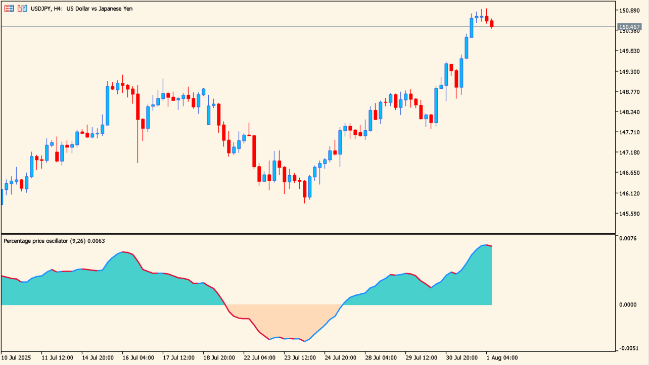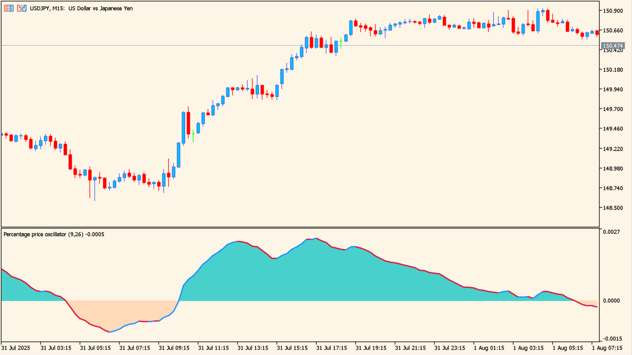 このインジケーターは、価格の勢いを測るのに使われ、0ラインを中心としてプラス圏では強気トレンド、マイナス圏では弱気トレンドを示します。PPOライン(青線)とシグナルライン(赤線)のクロスで売買シグナルとして活用されることもあります。例えば、PPOラインがシグナルラインを上抜けた場合は買いシグナル、下抜けた場合は売りシグナルと見なされます。