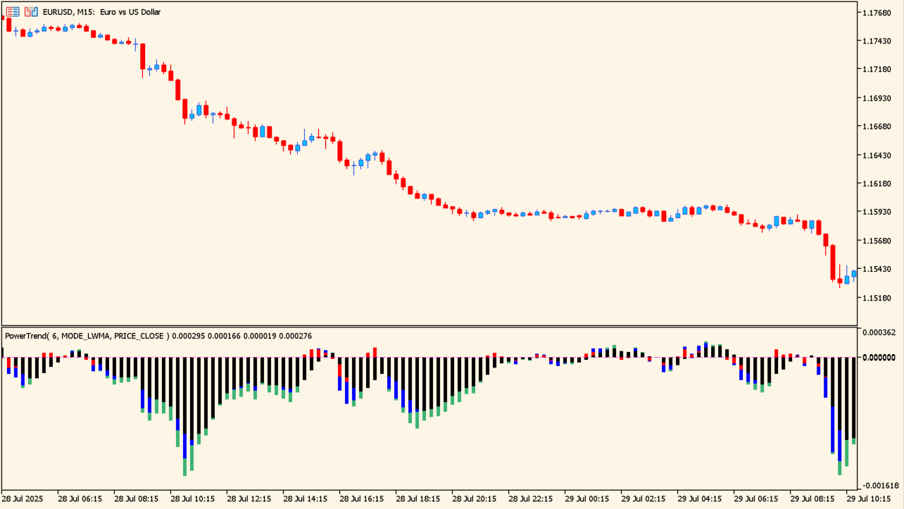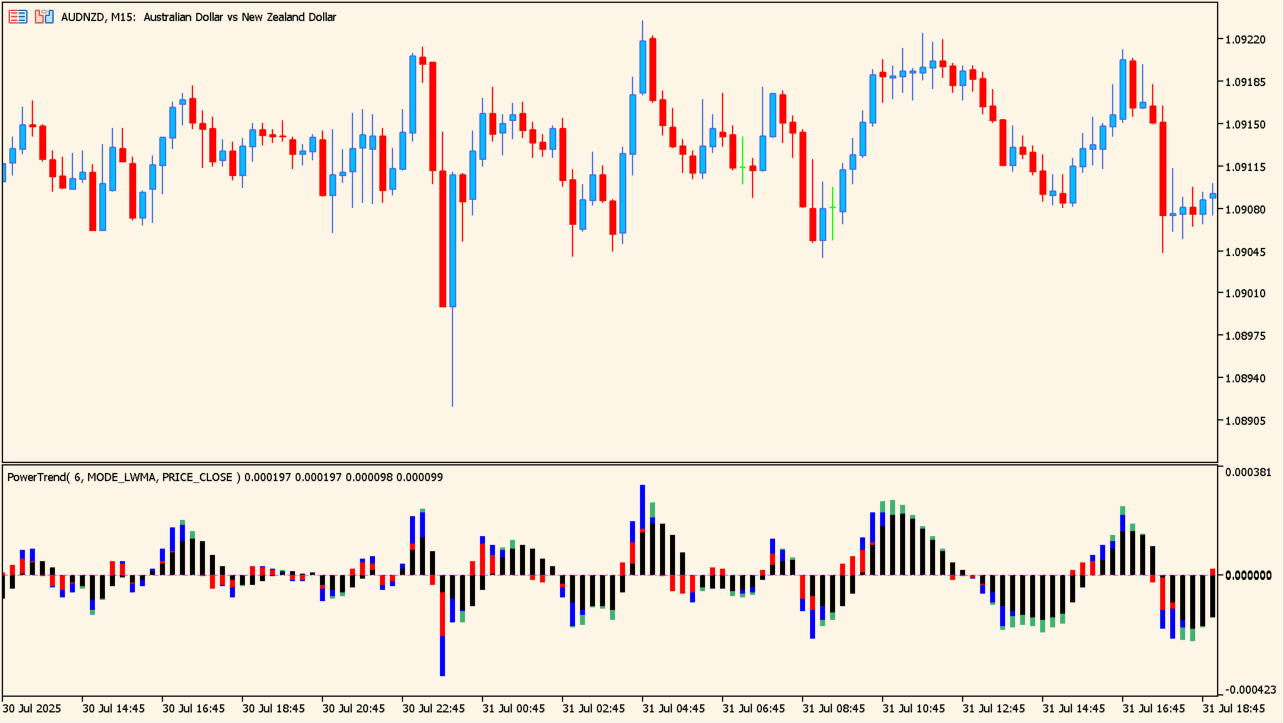 powertrendは、価格の変動とその勢いを視覚的に表現するインジケーターで、主にヒストグラム形式で表示されます。バーは価格の変動幅やトレンドの強弱を反映しており、色の変化(赤・青・緑)によって買い圧力・売り圧力・中立状態を判別可能です。バーが0ラインを上抜けて上昇傾向を示す場合は上昇トレンド、下抜けた場合は下降トレンドを示唆します。