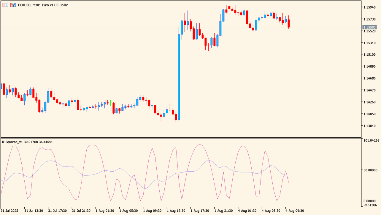 ただし、表示される数値は0〜1の範囲ではなく、100倍以上にスケーリングされており、チャート上では50や100を超える値が表示される仕様です。これは、通常のR²値を視覚的に強調するための調整で、値そのものよりも推移やピークの変化を重視して使います。
