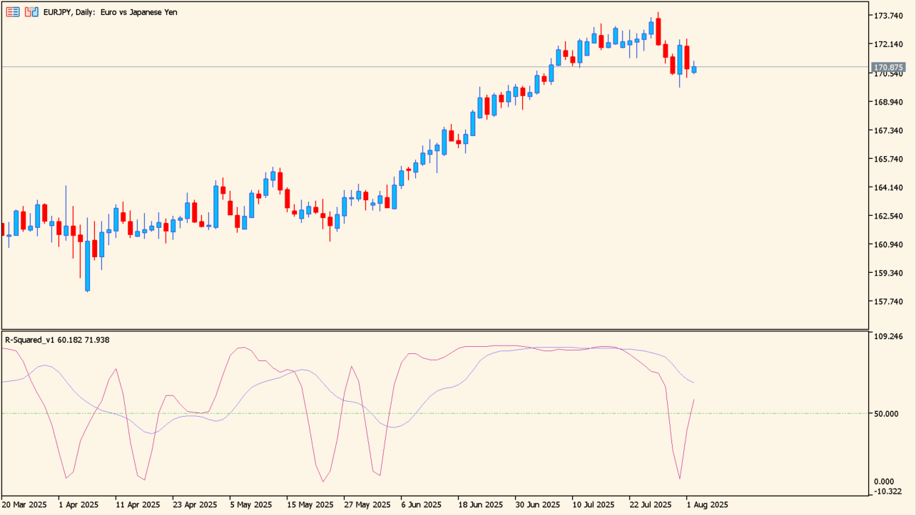 このR-Squaredインジケーターは、価格のトレンドの強さと一貫性を測定するためのツールで、統計学で使われる決定係数(R²)をもとにした計算を行っています。