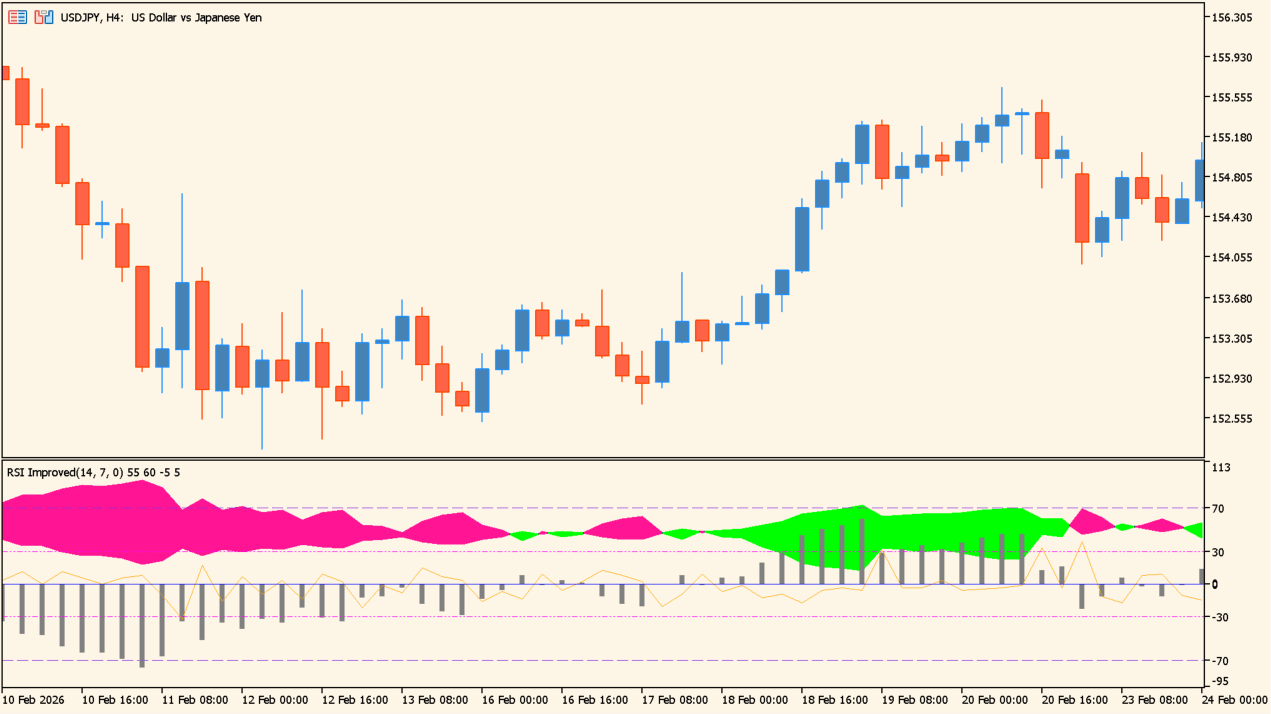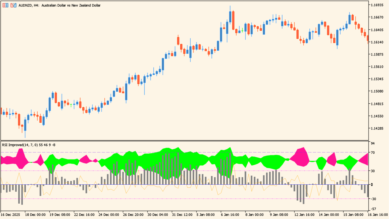 RSIをベースに改良を加え、相場の勢いと転換ポイントを色分け表示するMT5インジケーターです。
