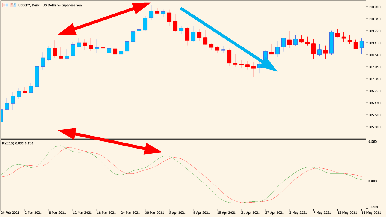 RVIの動きと価格の逆行現象(ダイバージェンス)の判別に使えます