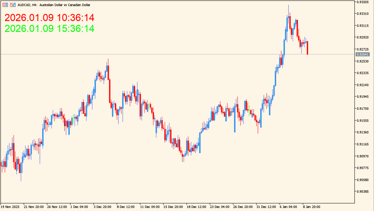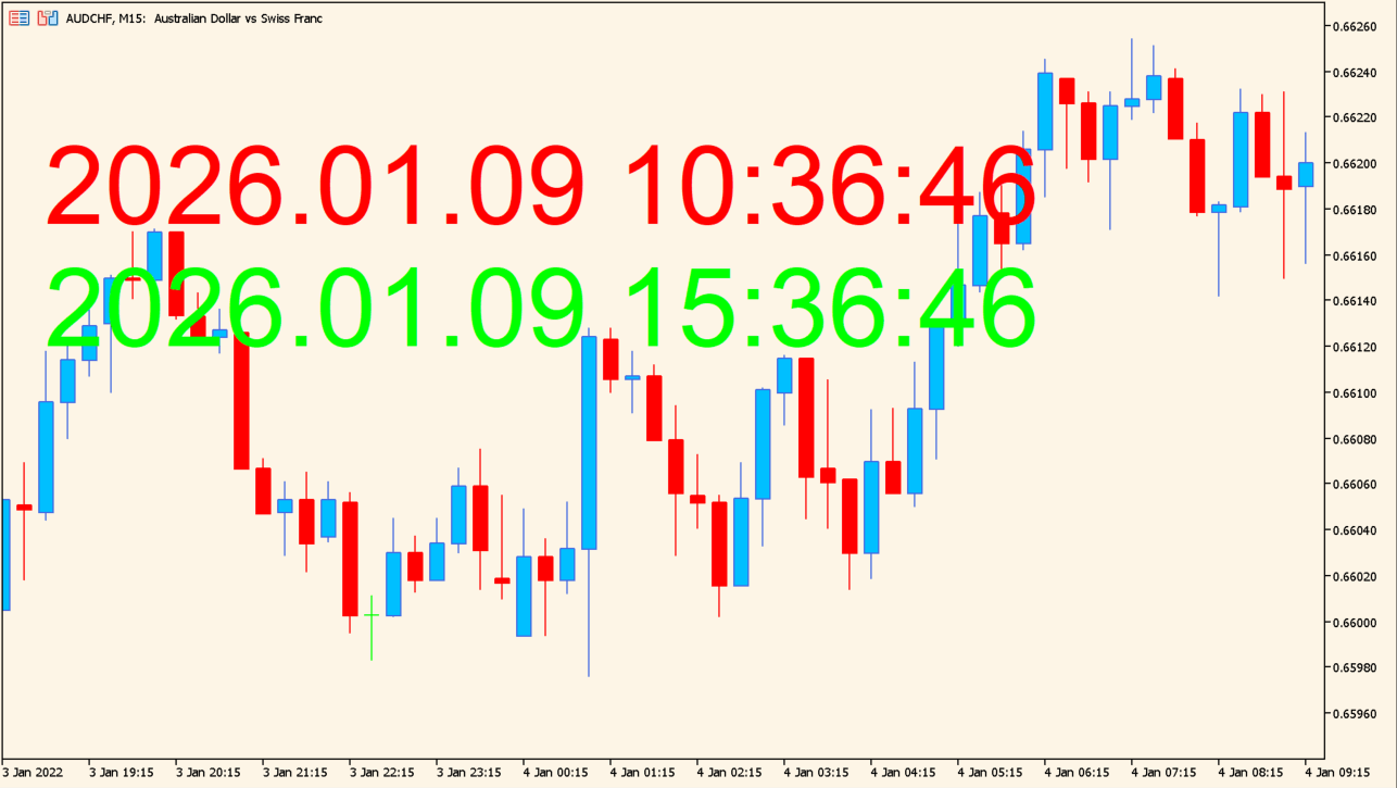 このインジケーターは、MT4/MT5上でブローカーサーバー時間と自分のPC(ローカル)時間を同時に表示するシンプルな補助ツールです。