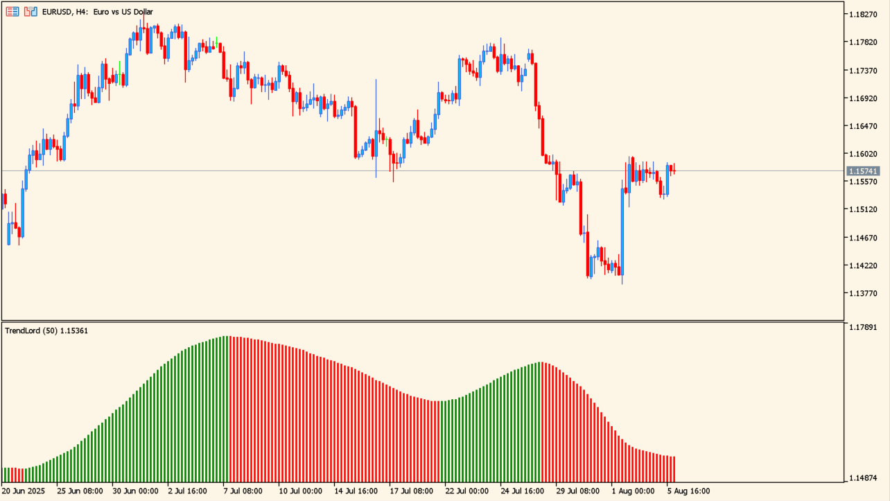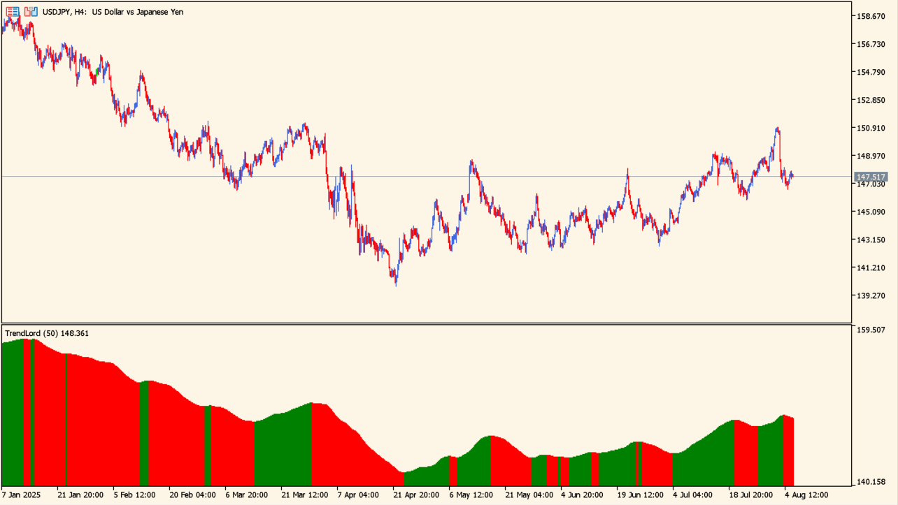 trend-lordは、価格の一定期間における動向を分析し、視覚的にトレンドの強弱と方向性を示します。チャート下部に表示されるヒストグラムが赤色の場合は下降トレンド、緑色の場合は上昇トレンドを表します。