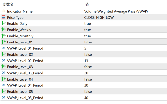 パラメータで特定期間のVWAPレベル(レジスタンス・サポート間隔)を追加表示でき、短期から長期の節目を視覚的に確認できます。