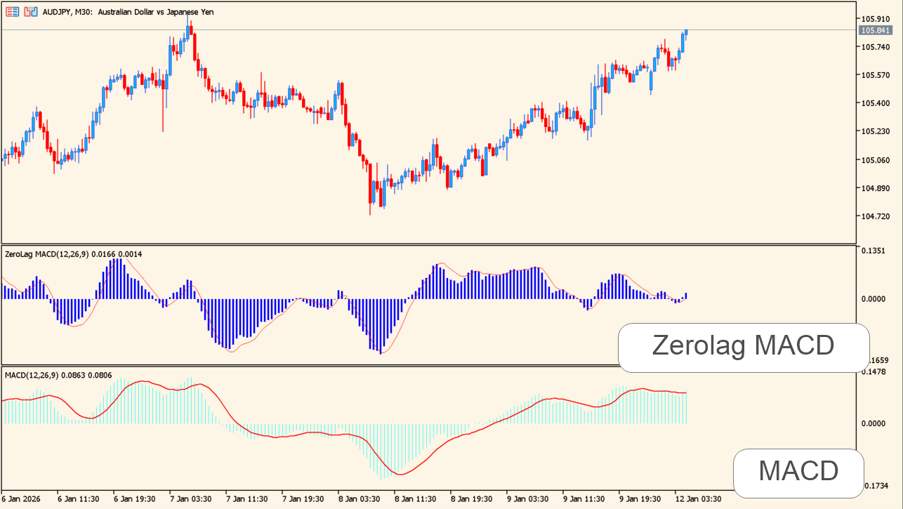 このインジケーターは、遅延が少ないZeroLag処理されたMACD値をヒストグラムで表示し、同時にシグナルラインを重ねて描画します。
