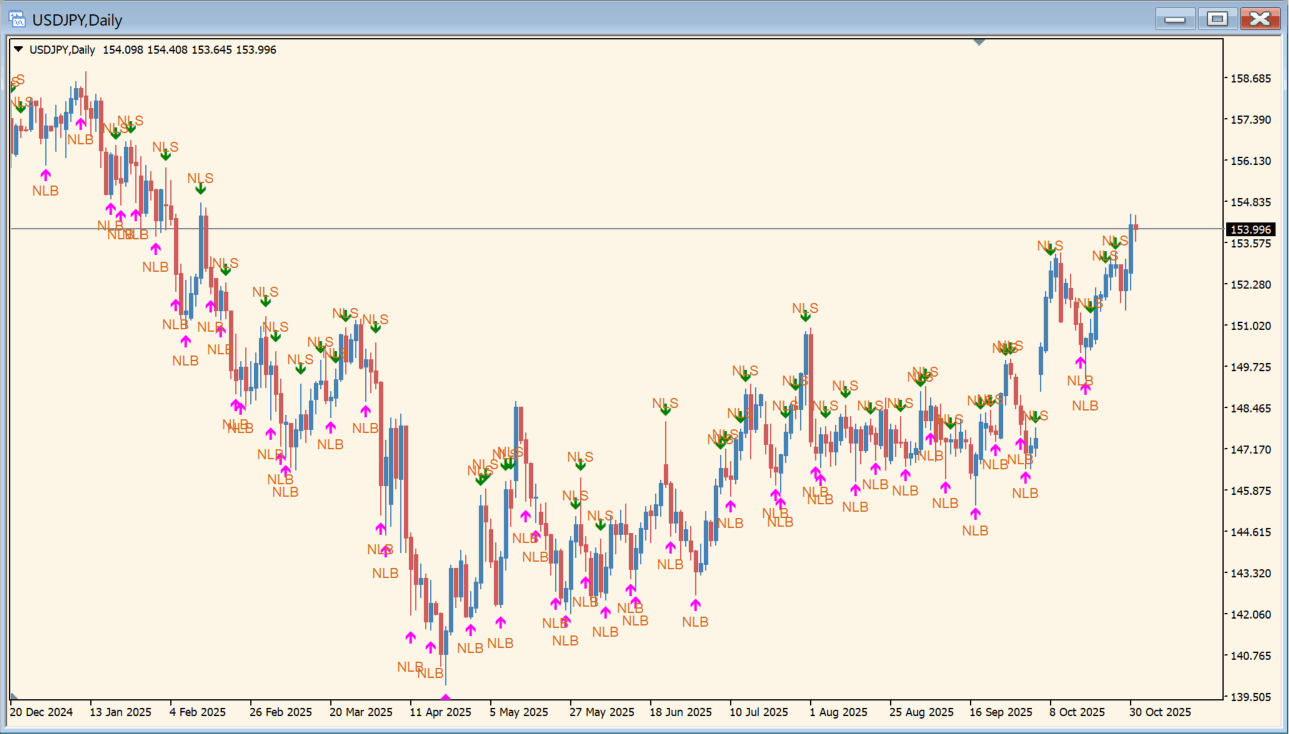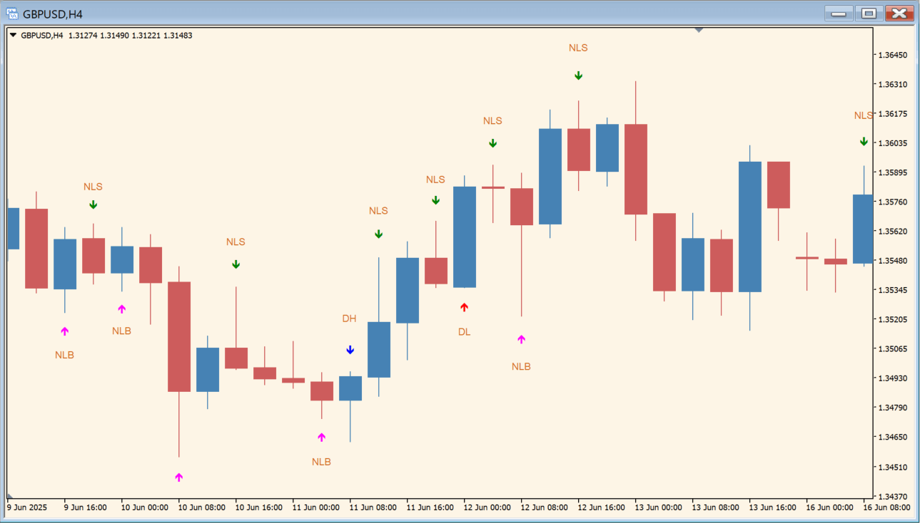 ピンクの矢印(NLB)は下ヒゲの長いローソク足に出現し、買い圧力の強まりを示します。一方、緑の矢印(NLS)は上ヒゲの長いローソク足に出現し、売り圧力が強まっているサインです。