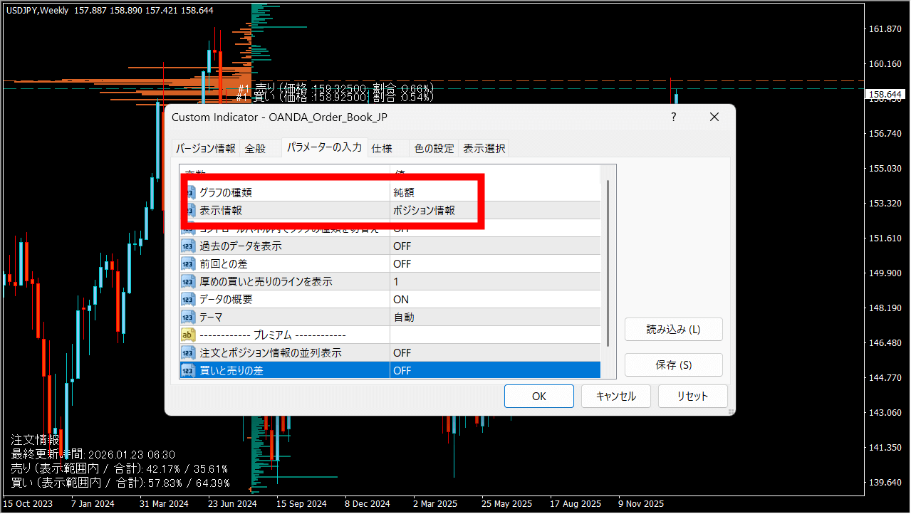 新型インジケーター: 現在は「OANDA_Order_Book_JP」という新型が主流です。旧型を使っている場合は、最新版へのアップデートを推奨します。