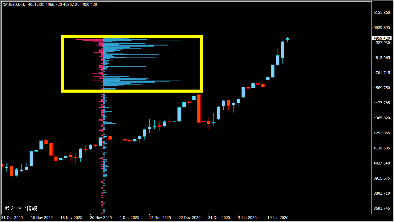 オープンポジションで、売りの含み損ポジションが大量にでているのが見えます。これで価格が上昇すると買い戻しがおきて上昇が加速しやすくなります。